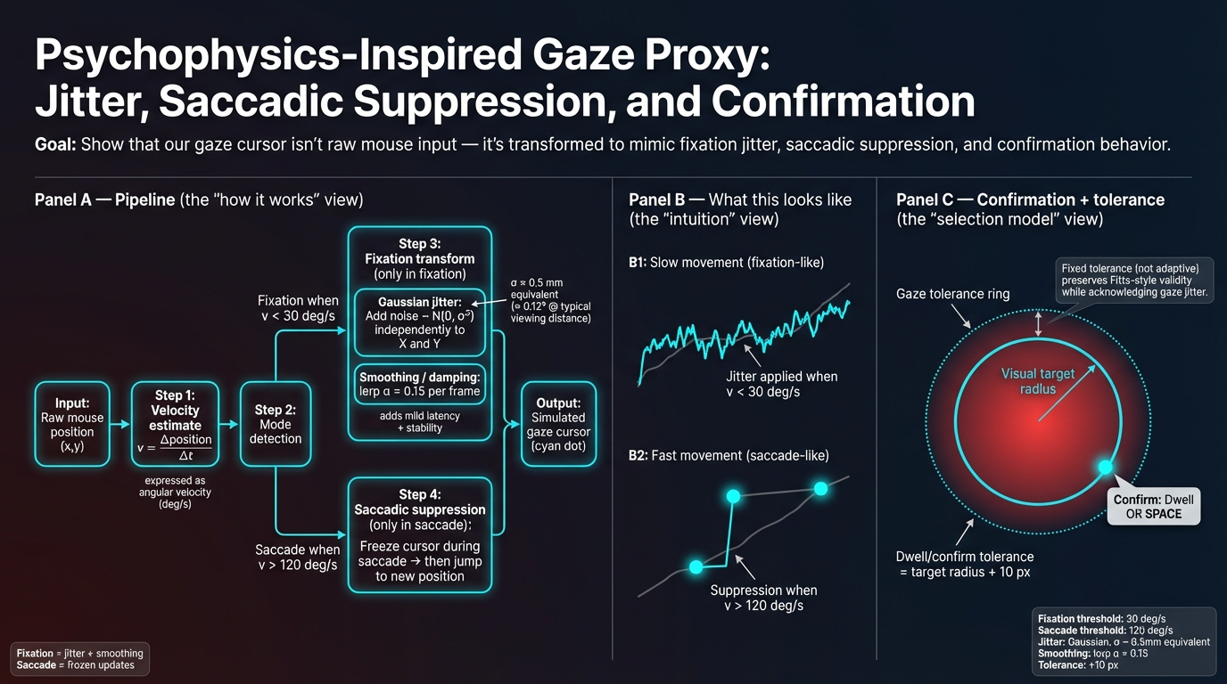 - Saccadic suppression: Temporary input masking during rapid eye movements (saccades). Prevents false selections during eye movements, mimicking how real eye trackers suppress input during saccades.