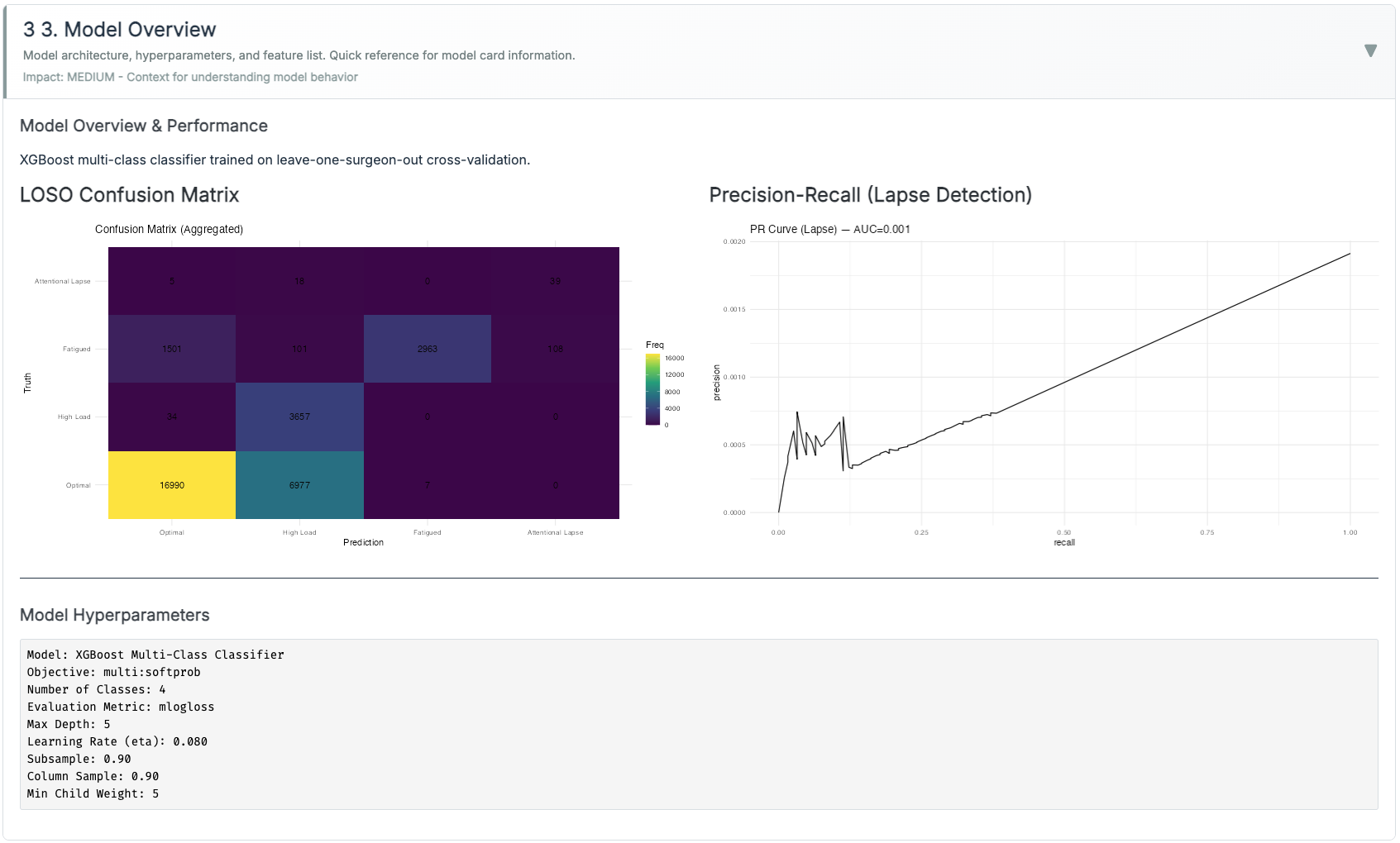 Runs as a Docker image or on ShinyApps; can embed in training portals with a single <iframe>. By default, surgeon biometrics are ephemeral: we retain only de-identified aggregates (for QA/research) with explicit consent. The system is assistive, not autonomous—the clinician remains in the loop, with visible rationale for alerts.