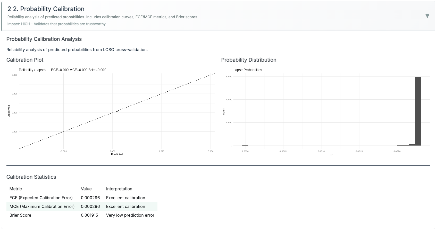 | Calibration | XGBoost + Platt scaling; reliability curve (ECE/Brier) | Not model-based; exports policy defaults |