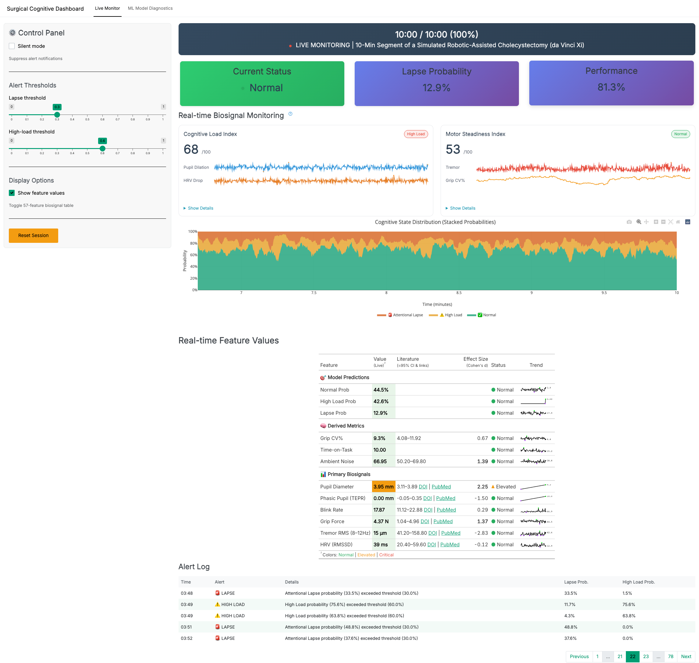 - Production Dashboard: runs those policies in real time using pupil + grip/tremor + HRV, tuned to prevent alarm fatigue and respect sterile-field constraints.