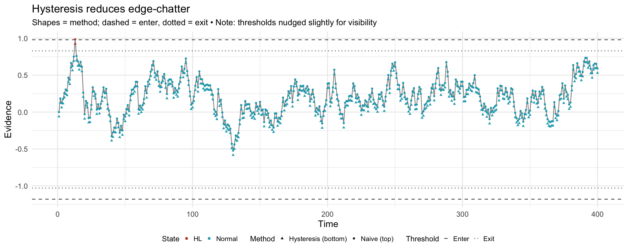 - Stability (↗). Fewer state flips near thresholds with hysteresis vs naive criteria.