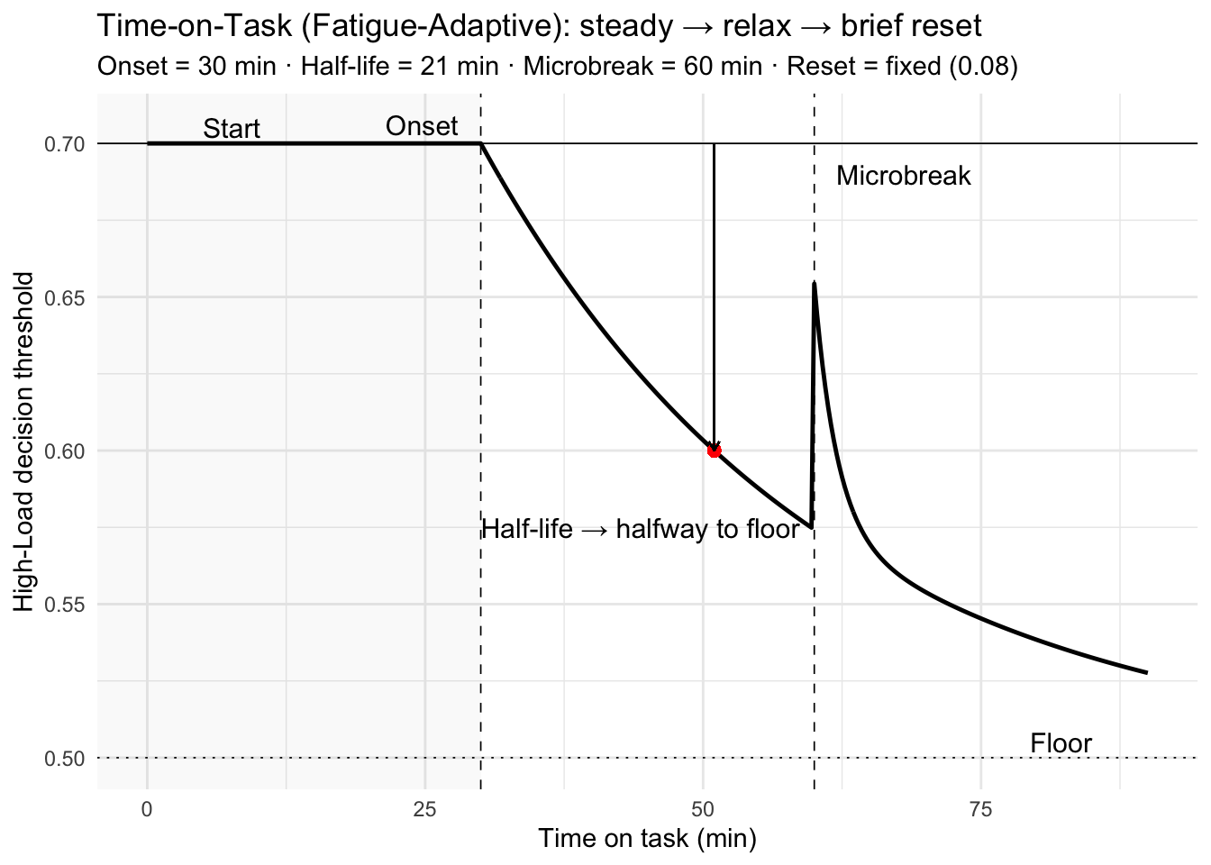 - Post-onset: the threshold relaxes exponentially toward the floor 0.50—i.e., the system becomes more tolerant of High-Load detections as vigilance degrades.